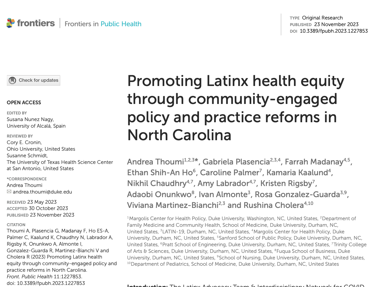 Thoumi A, Plasencia G, Madanay F, Ho ES-A, Palmer C, Kaalund K, Chaudhry N, Labrador A, Rigsby K, Onunkwo A, Almonte I, Gonzalez-Guarda R, Martinez-Bianchi V and Cholera R (2023) Promoting Latinx health equity through community-engaged policy and practice reforms in North Carolina. Front. Public Health 11:1227853.